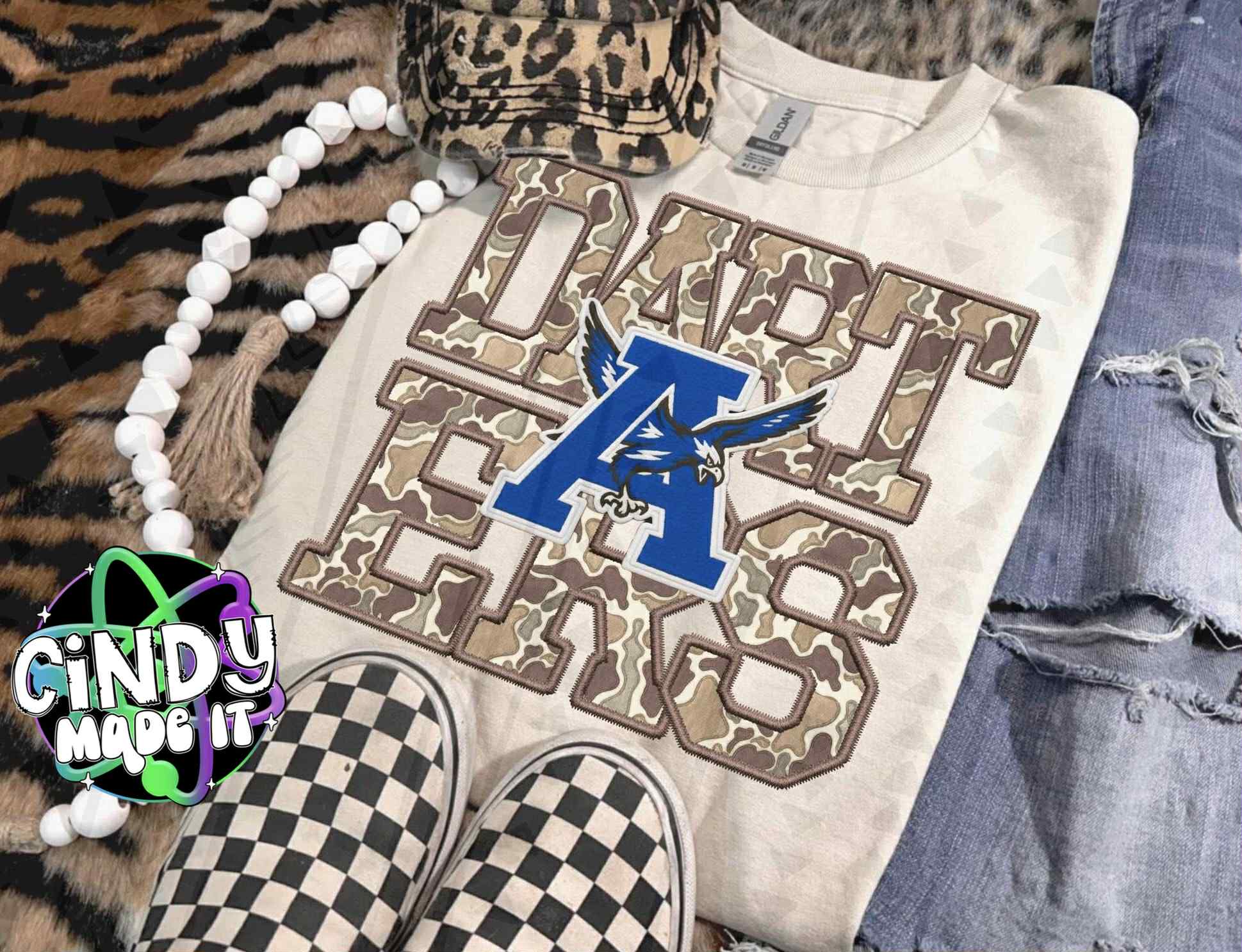 Faux embroidery Camo design “Darters” Hoodie (Gildan Sand) or Softstyle (Sand) poly/cotton blend t-shirt or Comfort Colors (Espresso) t-shirt.